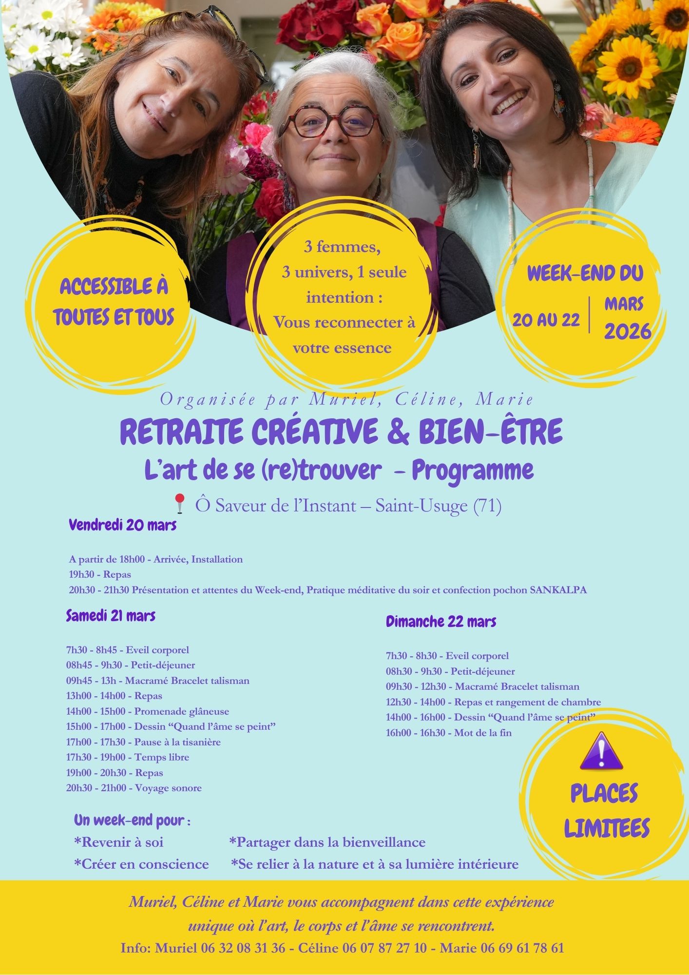 Un week-end pour ralentir, respirer, créer et vibrer au rythme du cœur. L’art de se retrouver, c’est se donner la permission d’exister pleinement. Trois femmes, trois univers, un même souffle : celui du retour à soi.